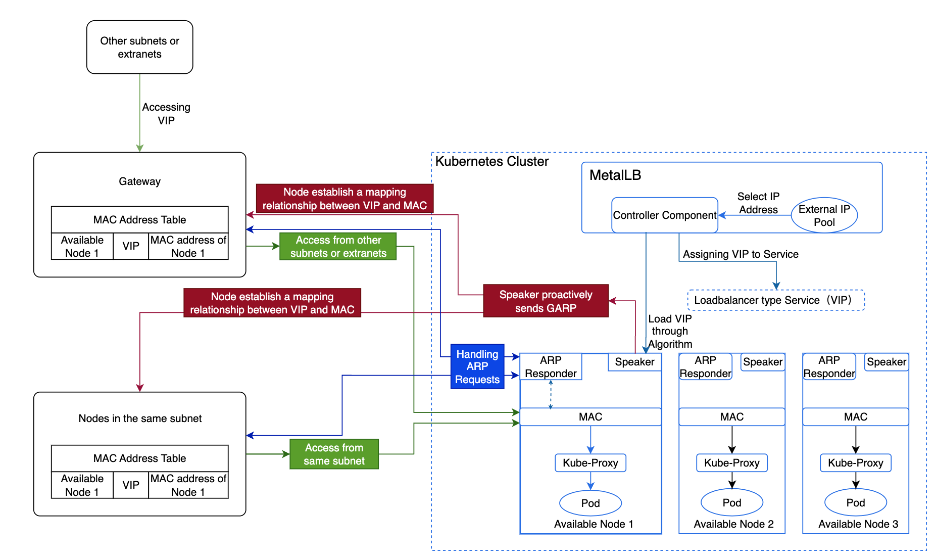 When this node encounters a failure, MetalLB selects another leader to host the VIP. Then send GARP to refresh Service IP mac address, thereby ensuring high availability.